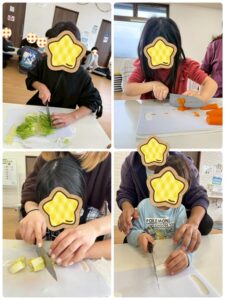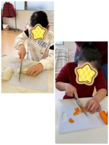 ピーラーを使ったり、本物の包丁を使ったりという機会は普段のクッキングでは少ないので不安そうな顔をしていましたが…