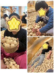木の卵が大量にあるところに寝そべったり、感触を楽しんだり、ひたすら集めたり…